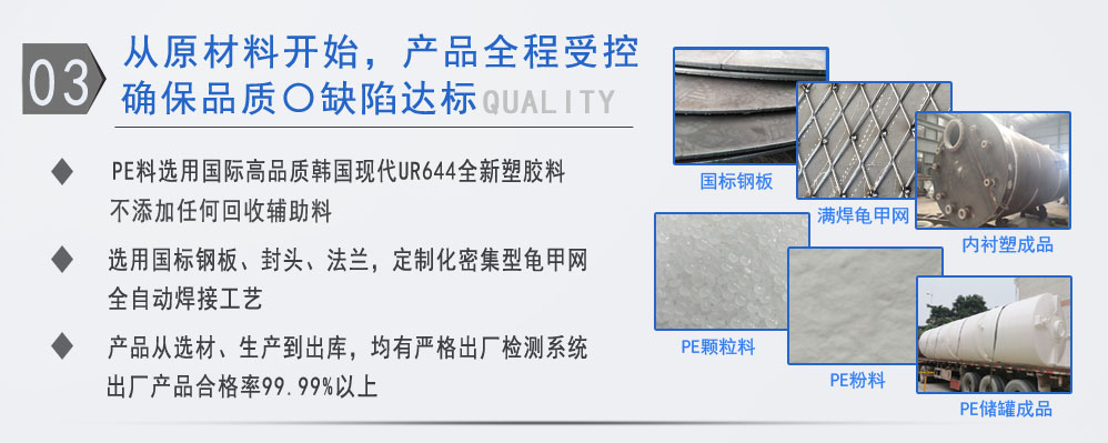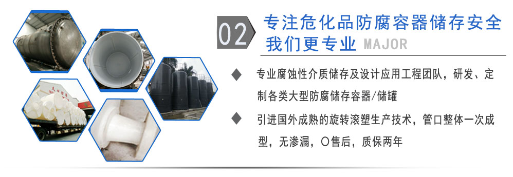 公司有鋼襯塑PE/PO、PE全塑、碳鋼、不銹鋼四大系列100多個品種,專注于常壓儲存容器生產,其產品包括鋼襯塑儲罐、管口一體成型PE儲罐、碳鋼儲罐不銹鋼儲罐、反應釜、攪拌罐、離子交換柱、鋼襯PE/PO儲罐、塑料儲罐鹽酸儲罐、硫酸儲罐等等。更大限度滿足廣大客戶的各種需求,同時可以根據客戶的需要加工定制各種防腐設備。